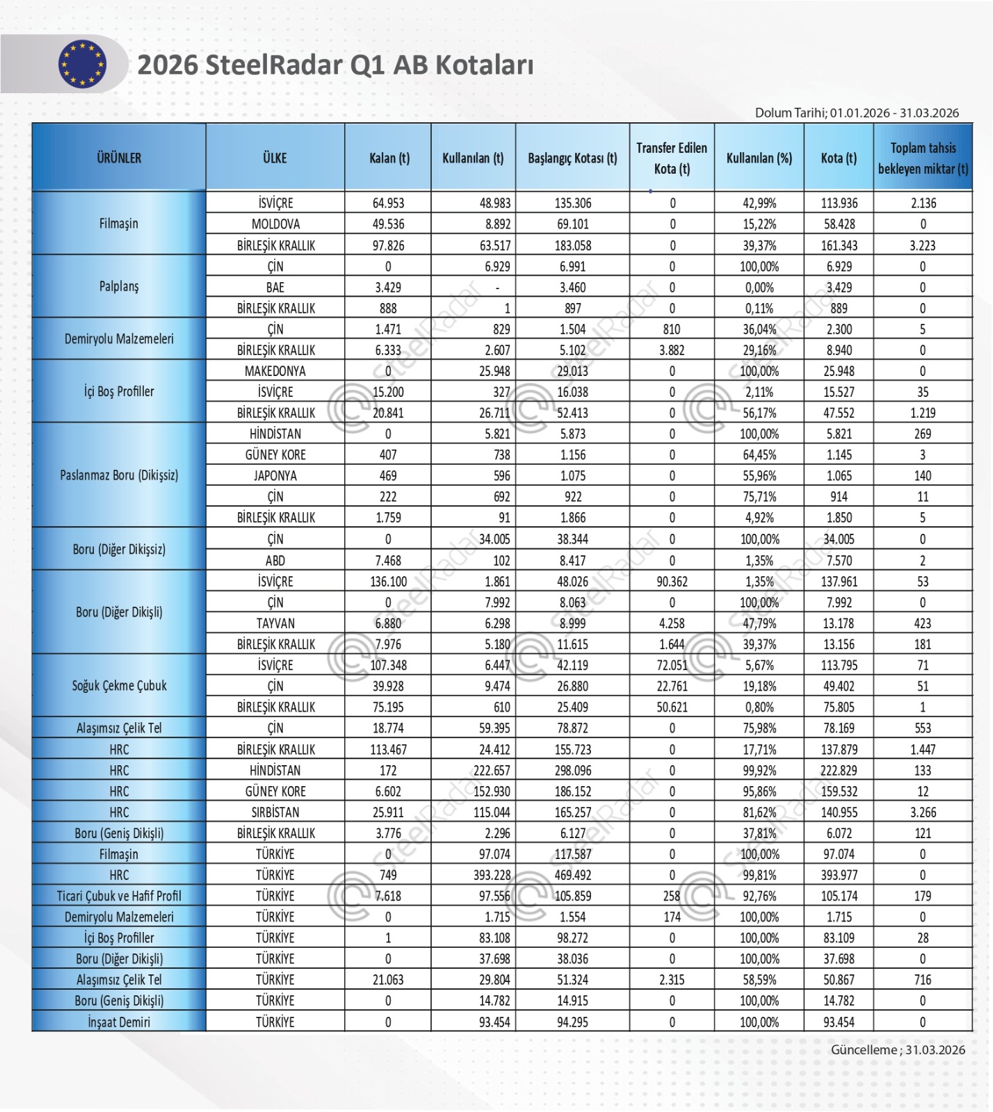 Türkiye, ilk çeyrekte en fazla ürün grubunda kotasını tamamen kullanan ülkeler arasında yer aldı. Türkiye 97.074 tonluk filmaşin, 93.454 tonluk inşaat demiri, 15.559 tonluk organik kaplamalı sac, 1.715 tonluk demiryolu malzemeleri, 37.698 tonluk diğer dikişli borular ve 14.782 tonluk geniş dikişli borular kotalarını tamamen doldurdu.