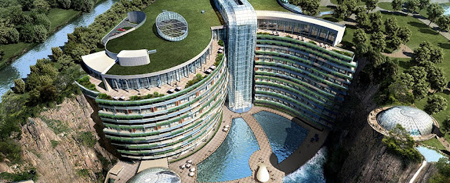 İki uçurum arasında kurulan ve bir uçtan diğer uca 170 metrelik bir alan kapsayan bu otel, asma bahçeleri ve su parkıyla bambaşka bir tatil seçeneği sunuyor.
