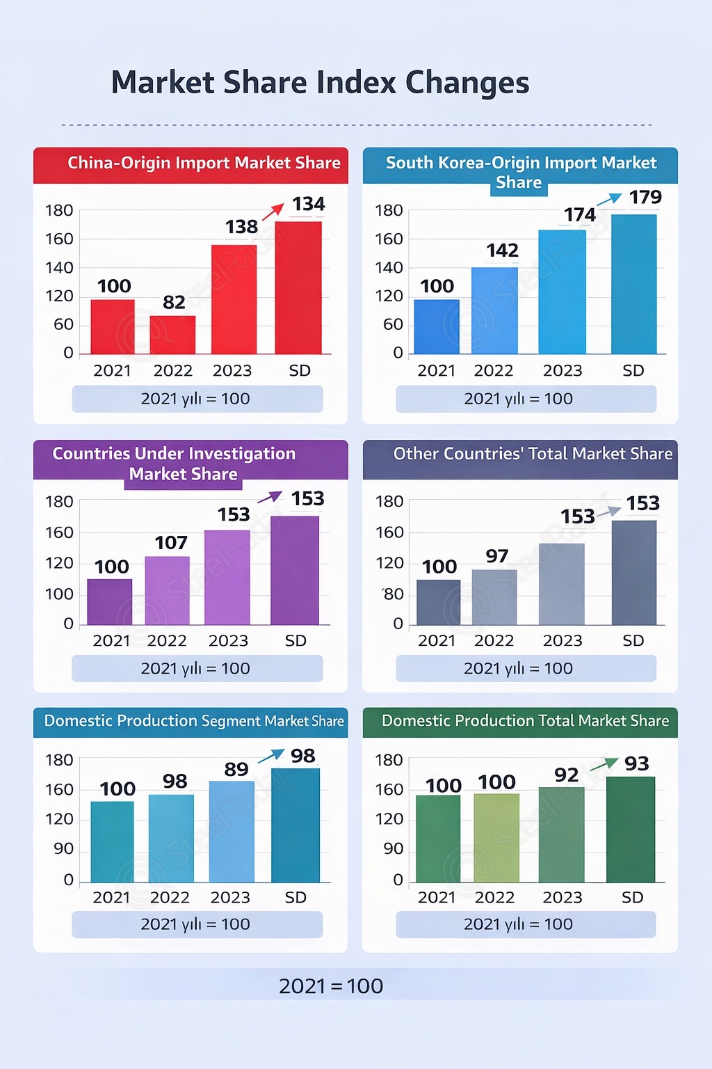 The share of imports from the countries under investigation in total imports also increased. This share rose from 41% in 2021 to 43% in 2022, 52% in 2023, and 53% during the POI period.