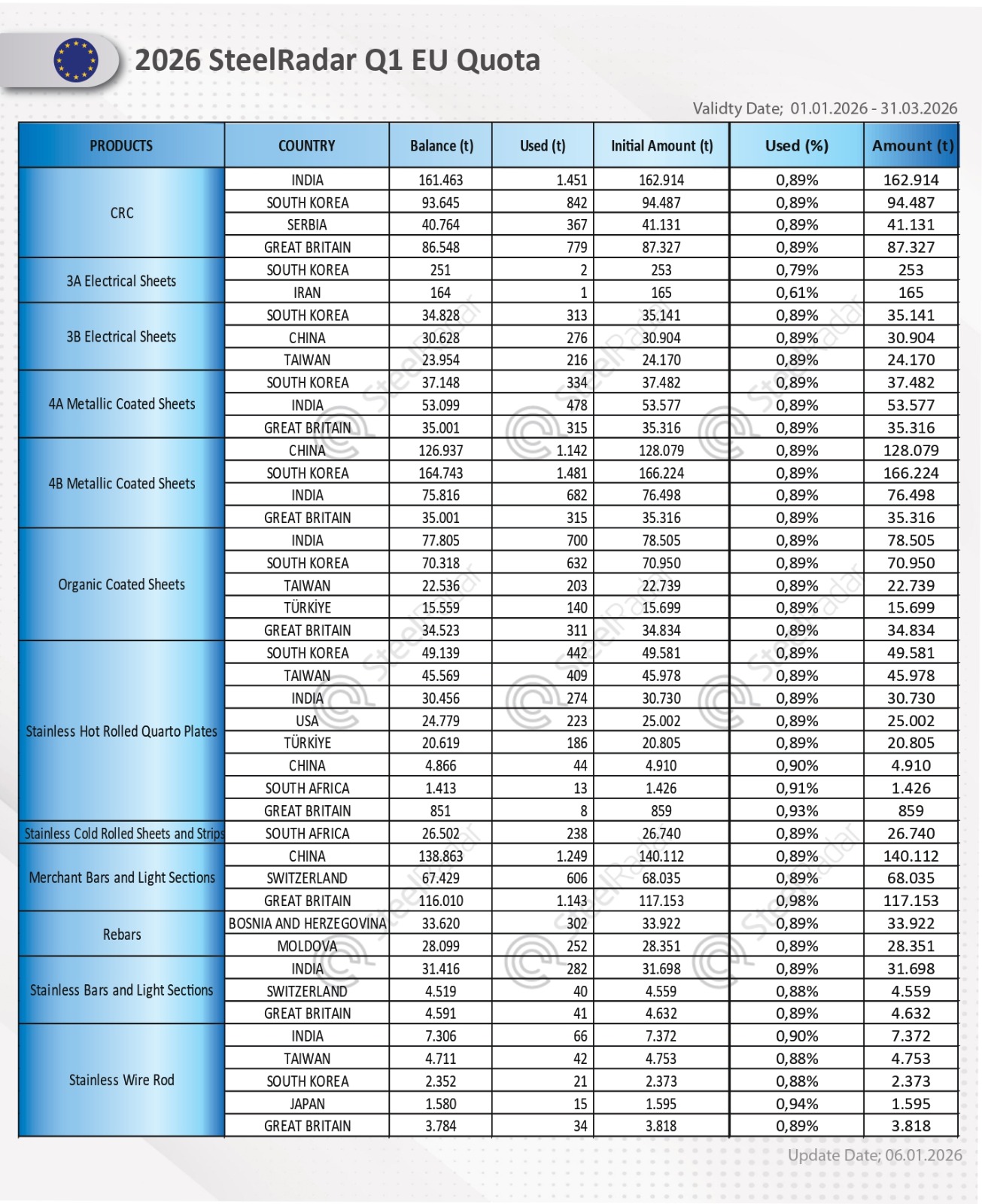 In the HRC category, Türkiye reached a utilization rate of 16.08%, using 75,515 tons out of its initial quota of 469,492 tons. India recorded the highest utilization rate among countries at 25.25%, consuming 75,267 tons out of a quota of 298,096 tons. South Korea used 26,620 tons out of its 186,152-ton quota (14.30%), while Serbia consumed 24,302 tons out of 165,257 tons (14.71%).