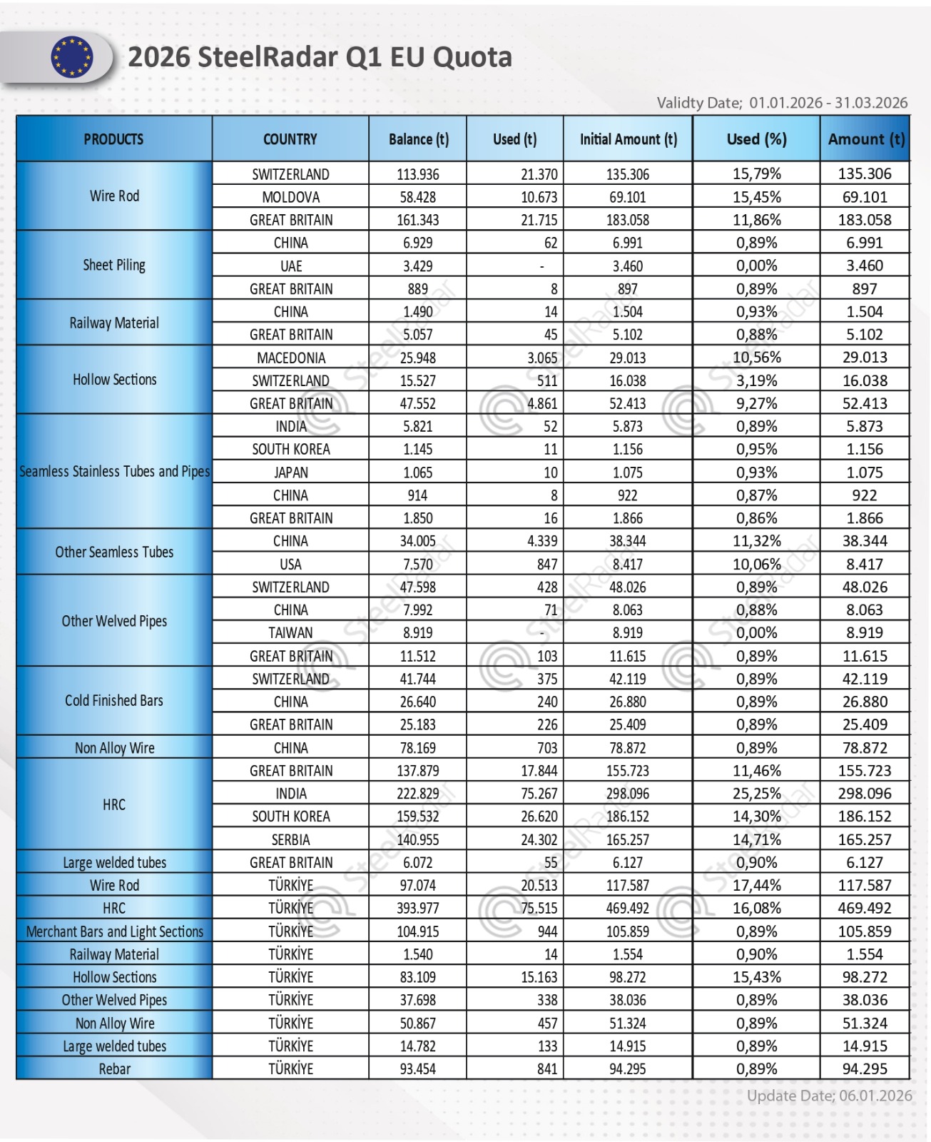 In the wire rod category, the United Kingdom used 21,715 tons out of its 183,058-ton quota (11.86%), Switzerland consumed 21,370 tons out of 135,306 tons (15.79%), and Türkiye used 20,513 tons out of 117,587 tons (17.44%). Despite this, overall utilization levels remained lower than in previous periods.