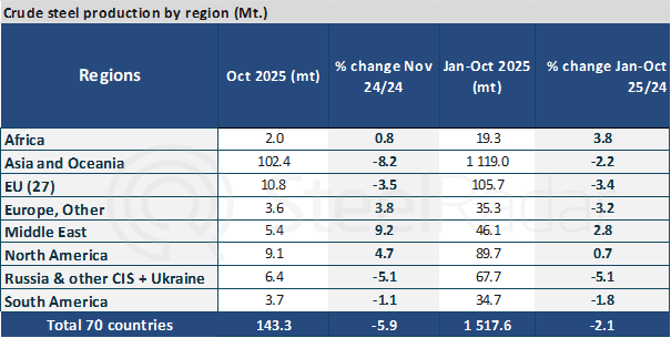 WorldSteel announced crude steel production figures for October 2025. Accordingly, crude steel production of 70 countries decreased by %5.9 year on year to 143.3 Mt.