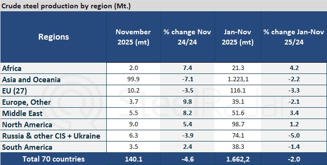 The World Steel Association (WorldSteel) announced crude steel production figures for November 2025. Accordingly, total crude steel production of 70 countries decreased by 4.6% compared to the same month of the previous year, reaching 140.1 Mt.