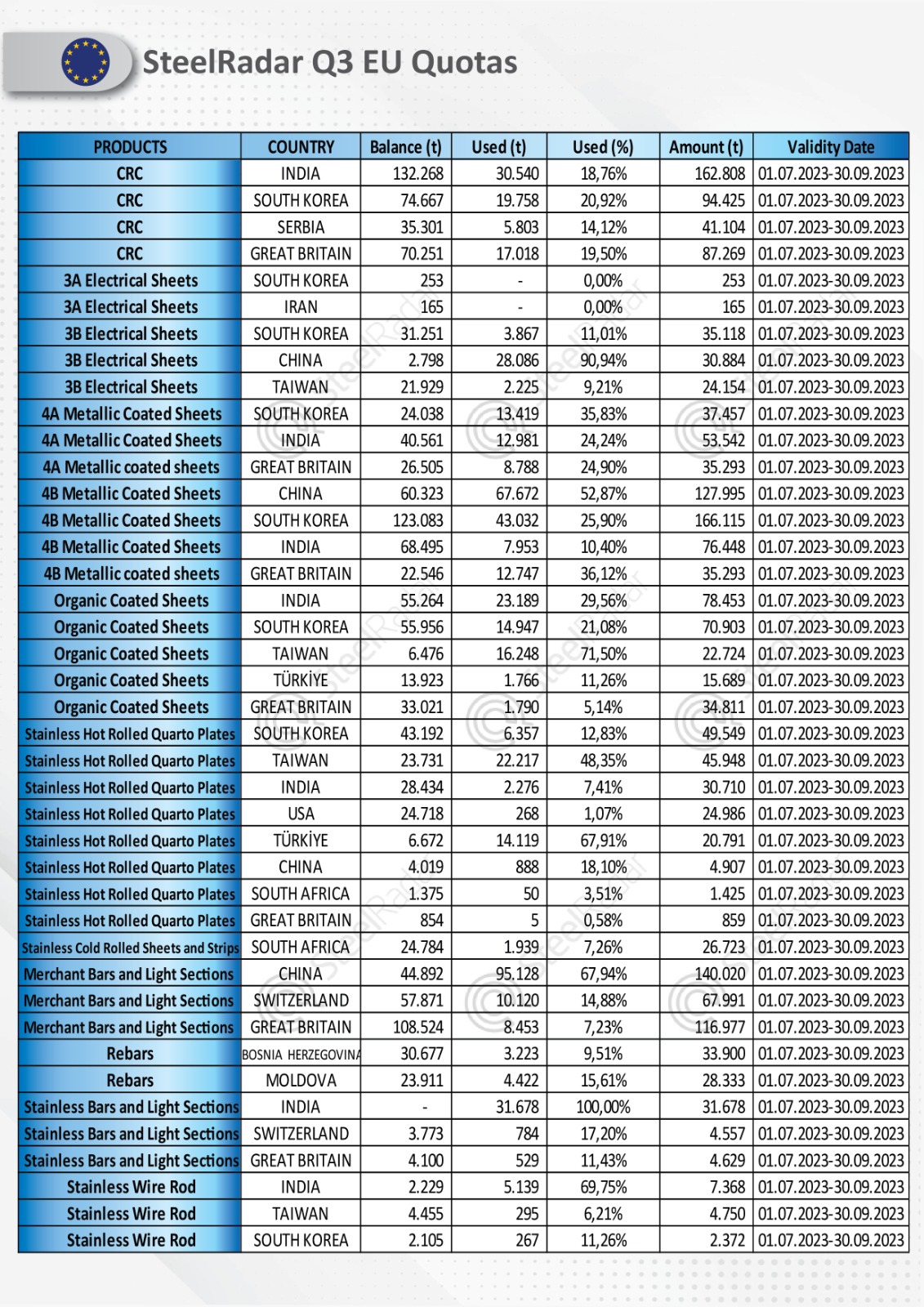 For HRC (hot rolled coil), 57,787/t of the EU quota of 469,183/t allocated to Turkey was utilised. In this figure, the utilisation of quotas was recorded as 12.32%. Turkey, which expects to regain its strength in flat steel, is affected by the lack of demand for flat steel in the global market and expects stronger movements in the last quarter of the year.