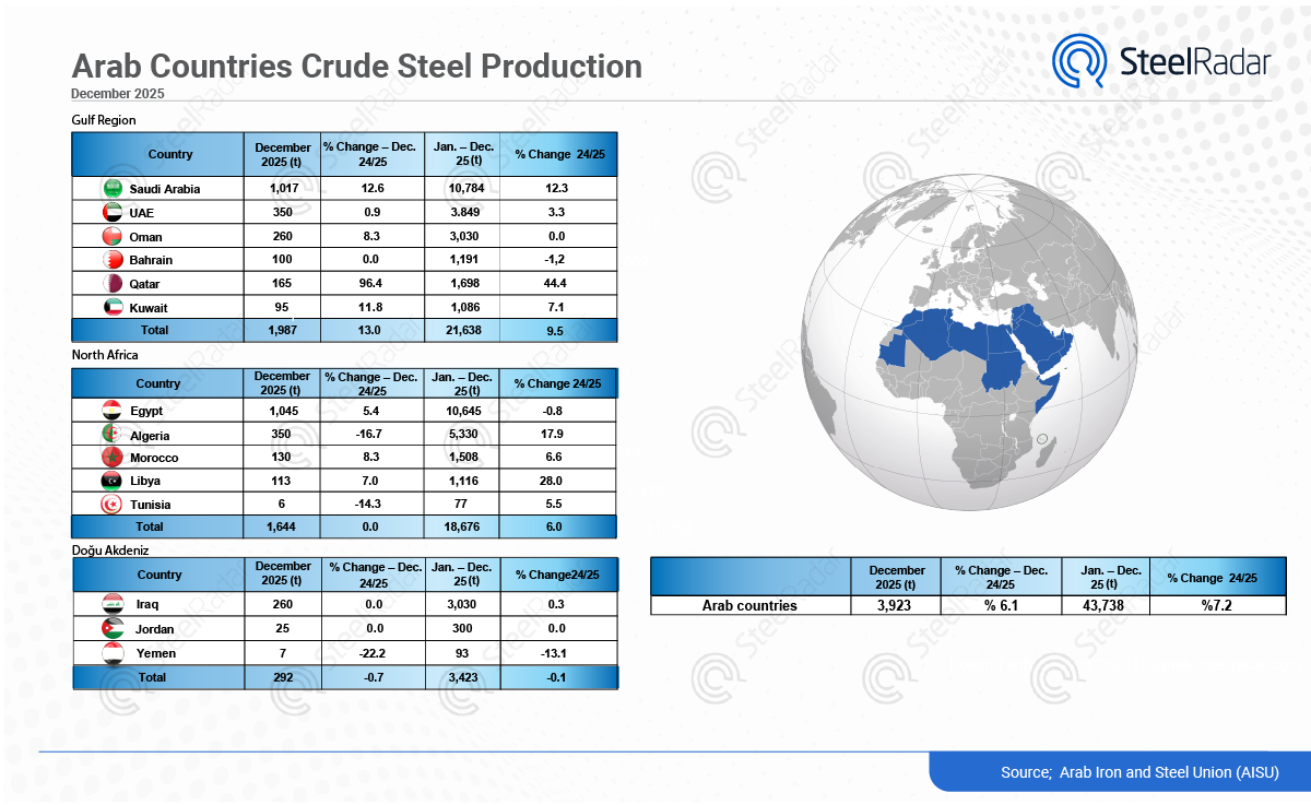 According to World Steel Association data, the region's total crude steel production increased by 7.2% during the January–December 2025 period, reaching 43.738 million tons. December output stood at 3.923 million tons, marking a year-on-year increase of 6.1%.