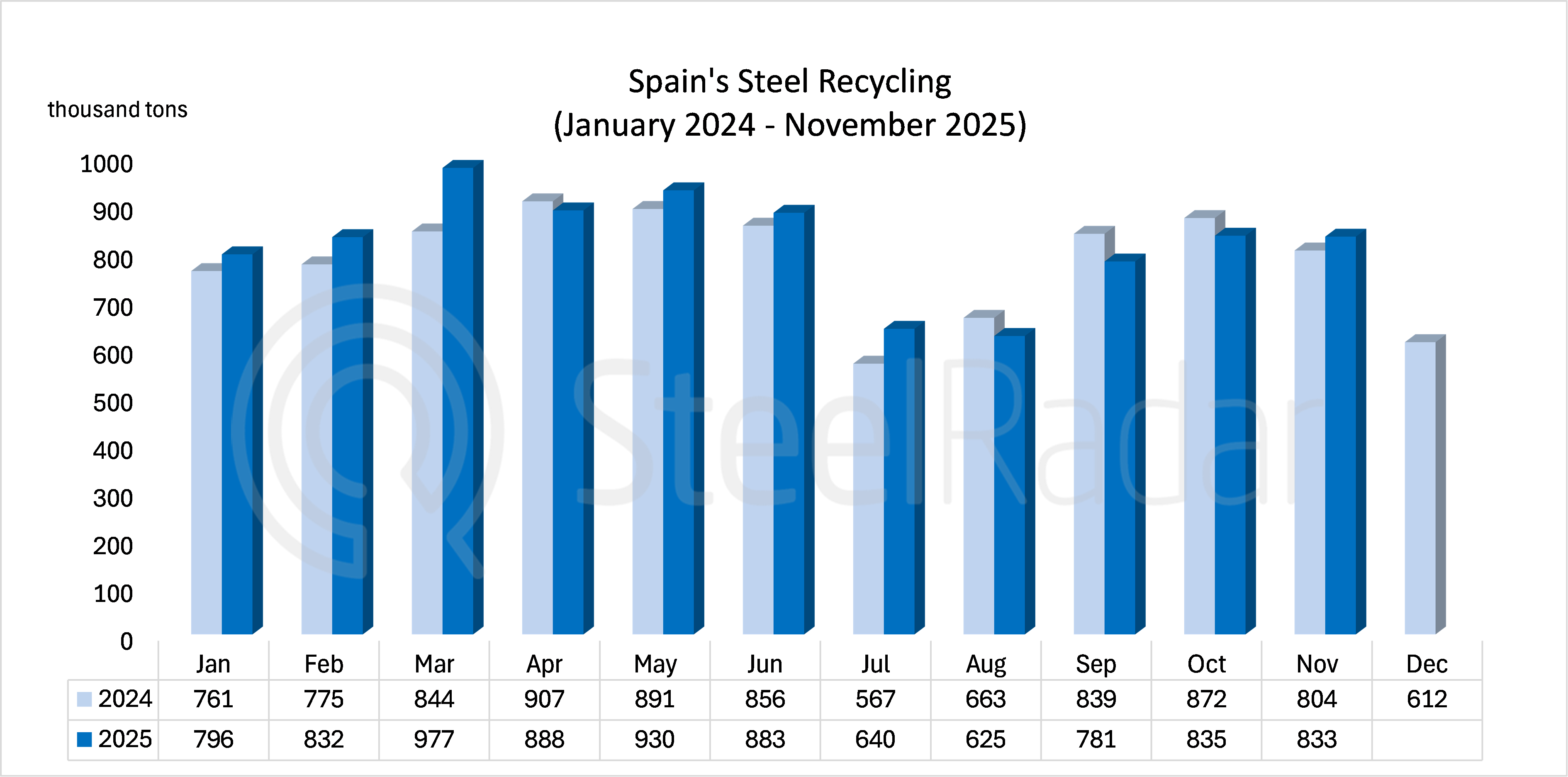 Meanwhile, scrap recycling recorded a year-on-year increase in November. Scrap recovery in Spain rose by 4% compared to the same month last year, reaching 833 thousand tons. However, this figure indicated a slight decline compared to October, when scrap recycling amounted to 835 thousand tons.