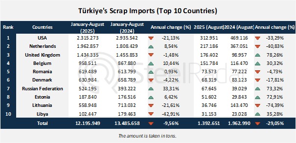In the month in question, Türkiye imported the most scrap from the United States. Imports from the U.S. fell 33.6% year-on-year to 312,951 tons, and over the first eight months of the year, they declined by 21.1% to 2,315,273 tons.