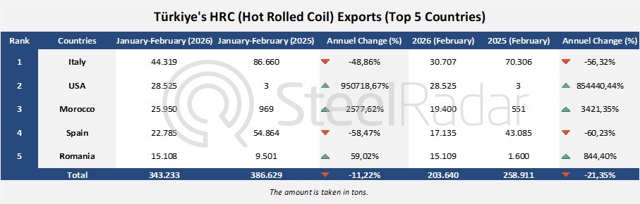 In the January–February period, total HRC exports declined by 11.22%, decreasing from 386,629 tons to 343,233 tons.