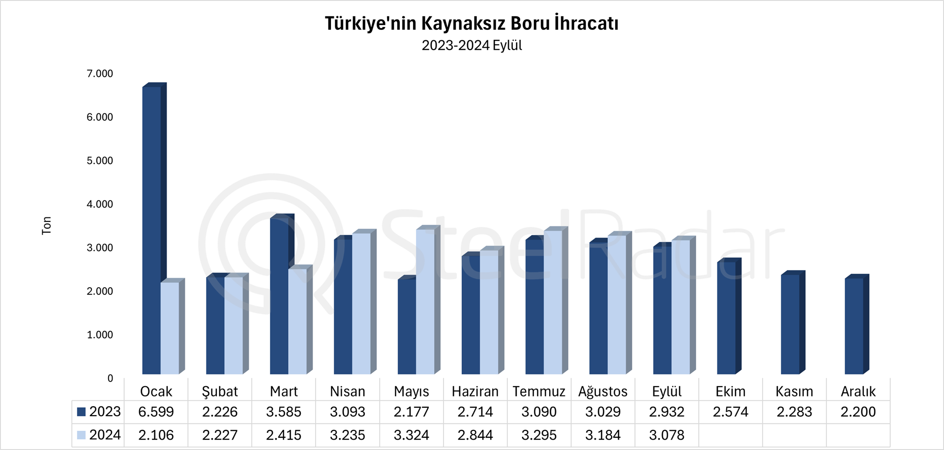 SteelRadar’ın Türkiye İstatistik Kurumu (TÜİK) verilerinden derlediği bilgilere göre, Türkiye’nin eylül ayı dikişsiz boru ihracatı bir önceki yılın aynı ayına göre %5 artarak 2.932 tondan 3.078 tona yükseldi.