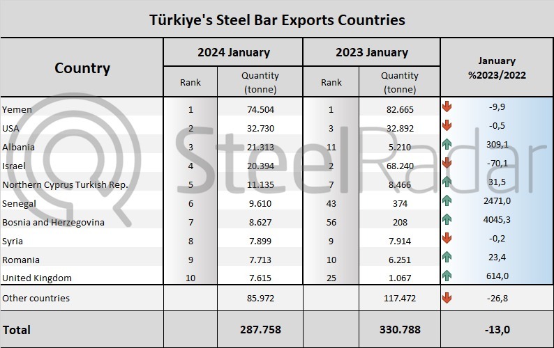In January, Türkiye exported the most steel bars to Yemen with 74,504 tons. However, this figure decreased by 9.9% compared to the same period of the previous year. The amount of exports to the USA, which ranks second, was 32,730 tons, and there was a 0.5% decrease in this figure. Exports to Albania increased by 309.1%, from 5,210 tons to 21,313 tons. However, the amount of exports to Israel decreased by 70.1%, from 68,240 tons to 20,394 tons. Northern Cyprus followed Israel with an export figure of 11,135 tons. Exports to Northern Cyprus increased by 31.5%, from 8,466 tons to 11,135 tons.