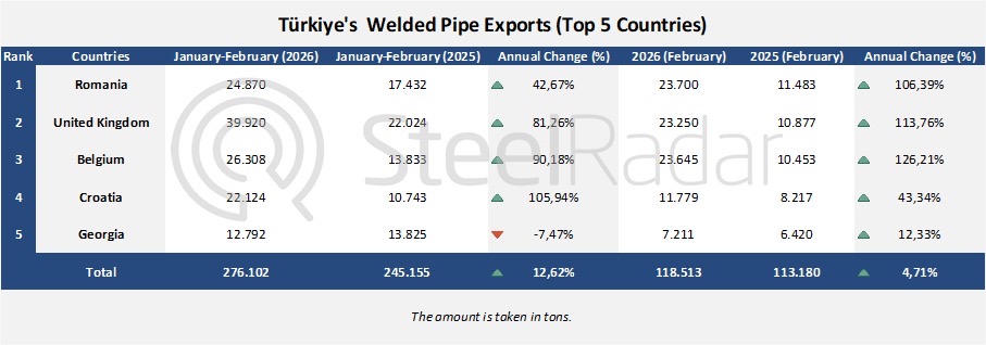 According to data compiled by SteelRadar from the Turkish Statistical Institute (TÜİK), Türkiye’s welded pipe exports in February increased by 4.7% compared to the same month of the previous year, rising from 113,180 tons to 118,513 tons. Compared to the previous month, January, this figure recorded an increase of 33%.