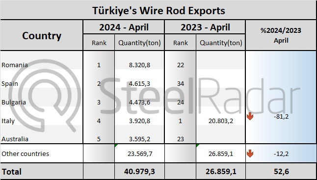 SteelRadar has compiled data from the Turkish Statistical Institute (TUIK) and calculated that Türkiye's April 2024 wire rod exports increased by 52.6% compared to the same month of the previous year, rising from 26,859 tons to 40,979 tons. It decreased by 70% compared to the previous month.