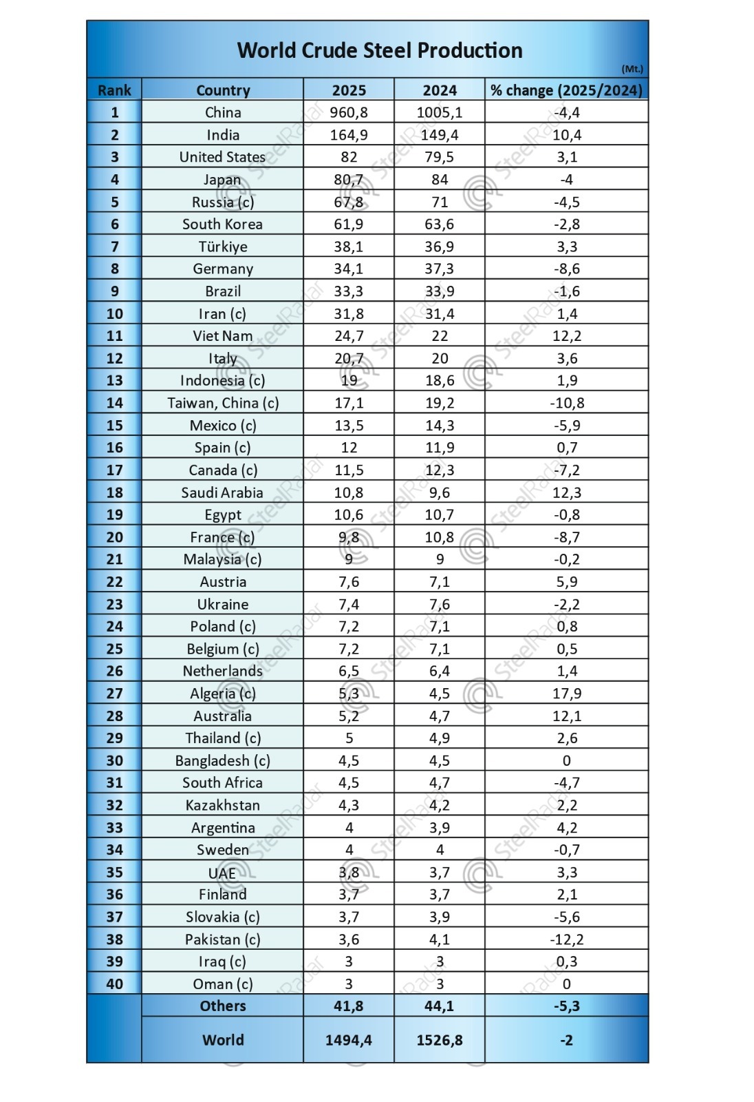 In contrast, strong production growth was recorded in several countries. Algeria posted the highest increase in crude steel production in 2025, rising by 17.9% from 4.5 million tonnes to 5.3 million tonnes. India, the world’s second largest crude steel producer, continued its upward trend with a 10.4% increase. India was followed by Vietnam with a 12.2% rise, Saudi Arabia with a 12.3% increase, and Australia with a 12.1% increase.