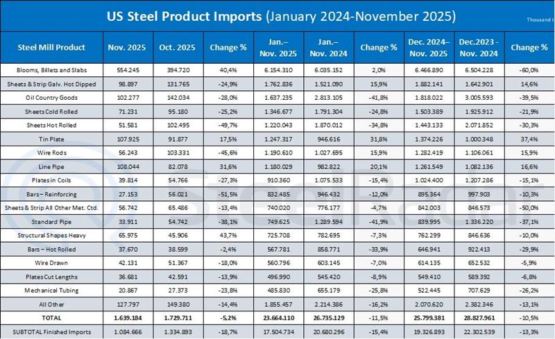 U.S. steel product imports fell by 11.5% during the January–November period