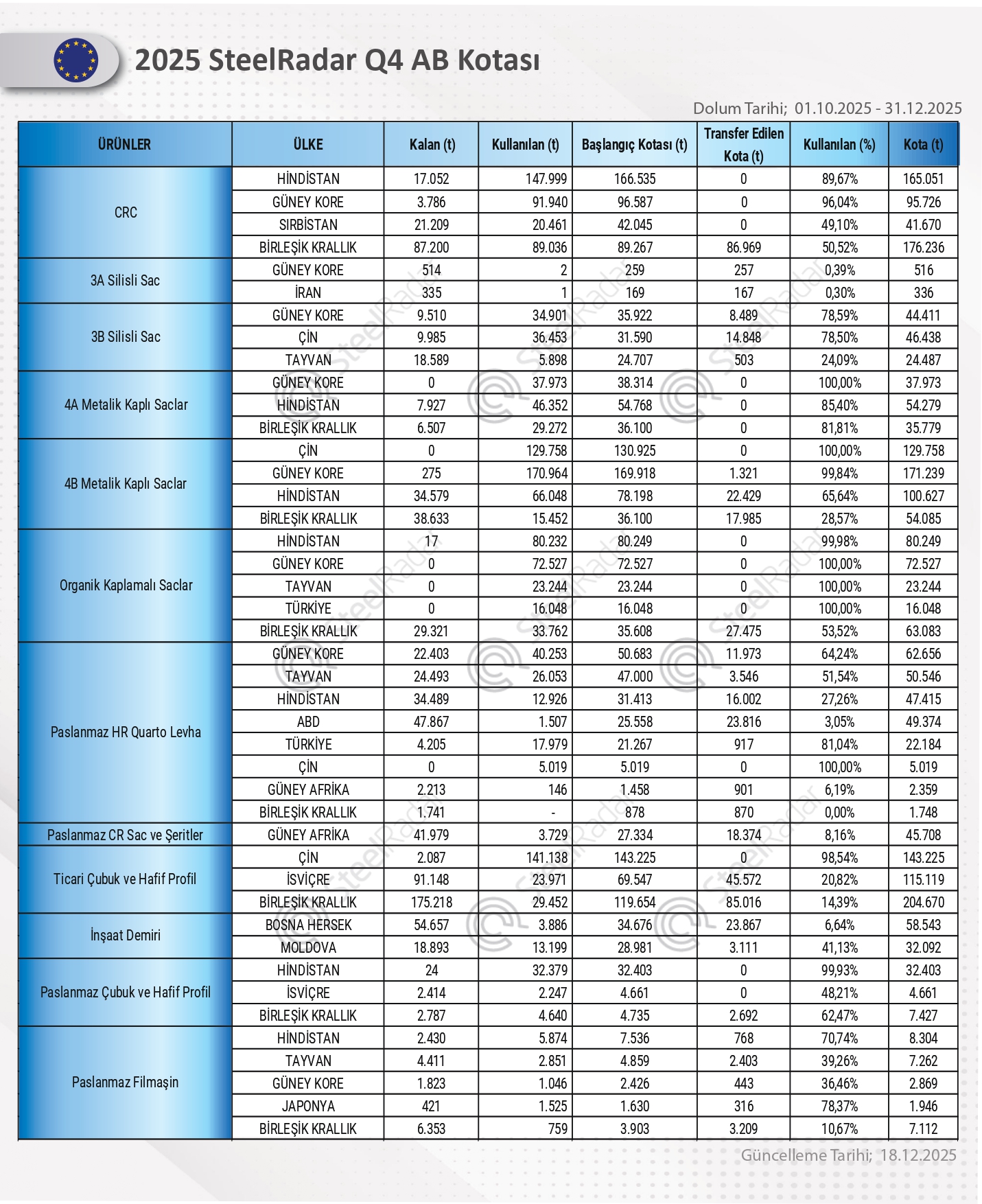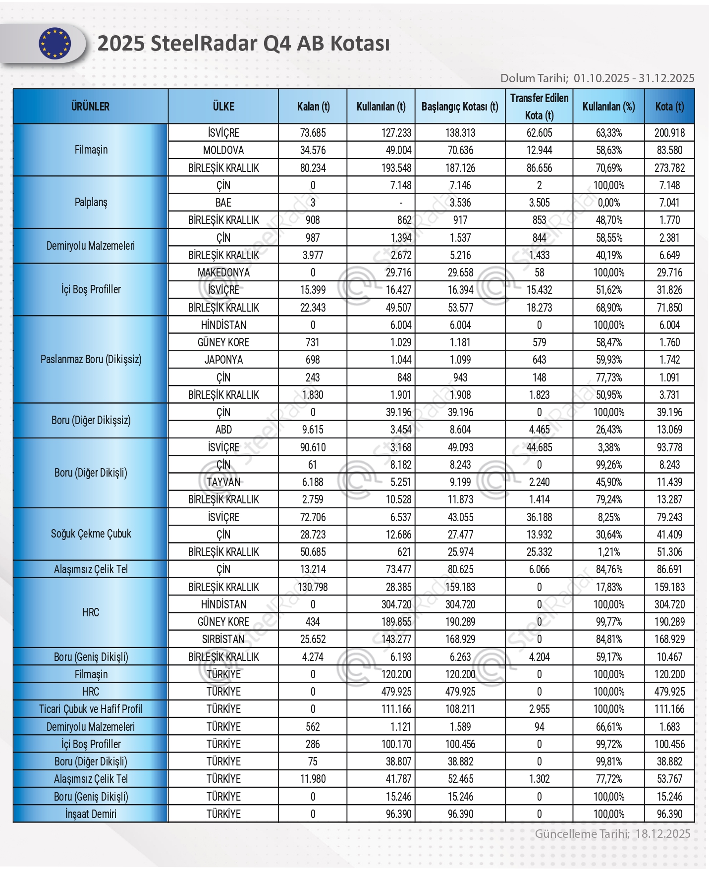 Ortaya çıkan tablo, yılın son kota döneminde AB çelik pazarında çok sayıda ürünün ülke bazında kota sınırına ulaştığını ve önümüzdeki haftalarda sevkiyat alanının daha da daralabileceğini gösteriyor.