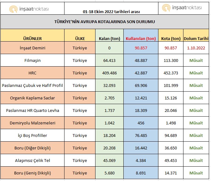 Türkiye’ye inşaat demiri için ayrılan kotalar (1 Ekim 2022 tarihinde) açıldığı gün itibariyle dolarken organik kaplamalı saclar, demir yolu malzemleri, dikişli borular ve paslanmaz quarto levha kotalarınında %70 yakını doldu.