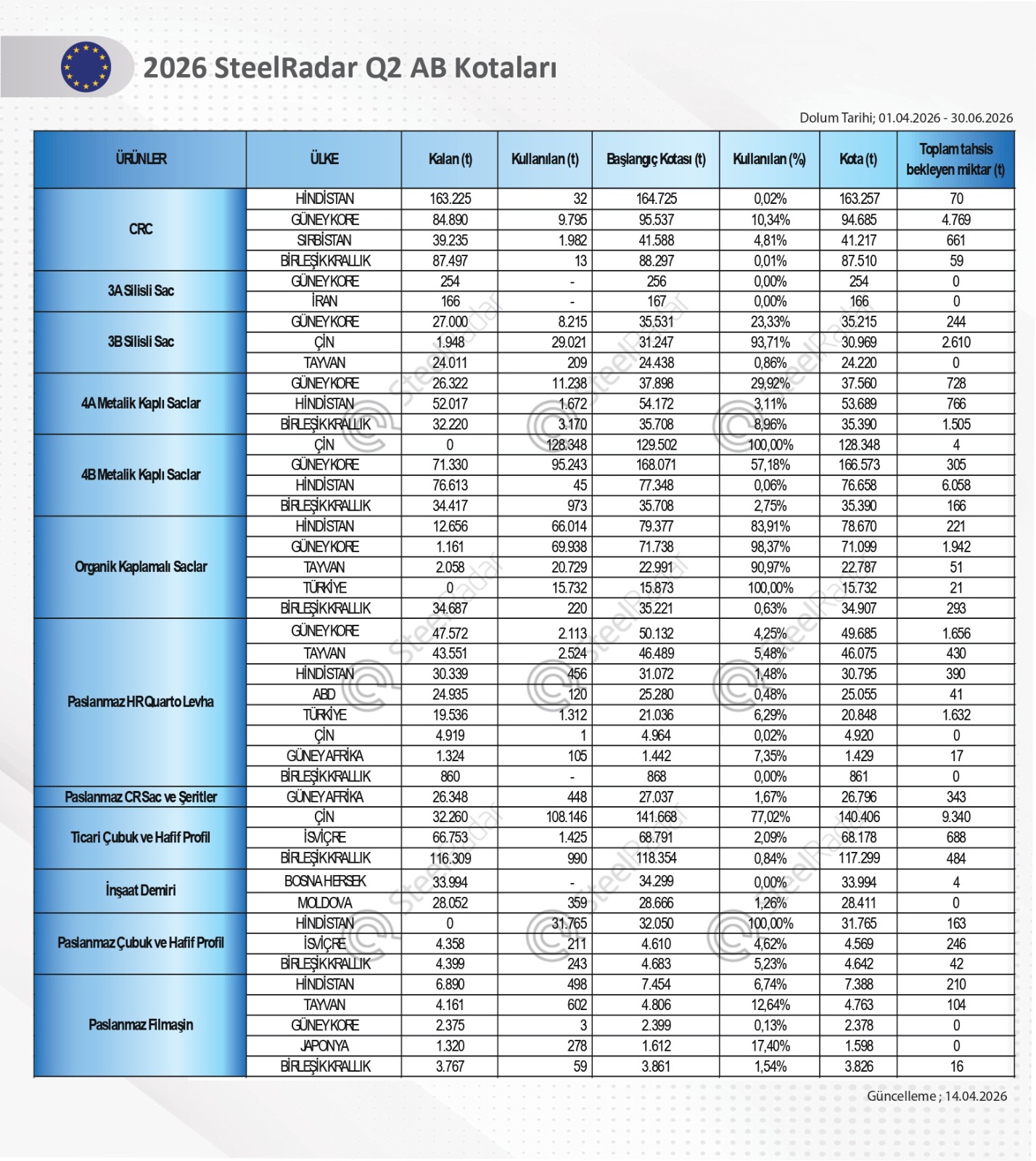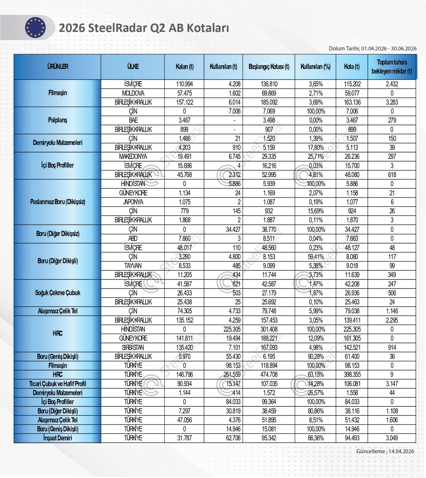 SteelRadar tarafından yapılan haftalık AB kota değerlendirmesine göre 1 Nisan–31 Haziran dönemine ait AB çelik ithalat kotalarında doluluk oranları hızla artarken, bazı ürün gruplarında Çin, Hindistan ve Türkiye’nin tam kapasite kullanıma ulaştığı görüldü.