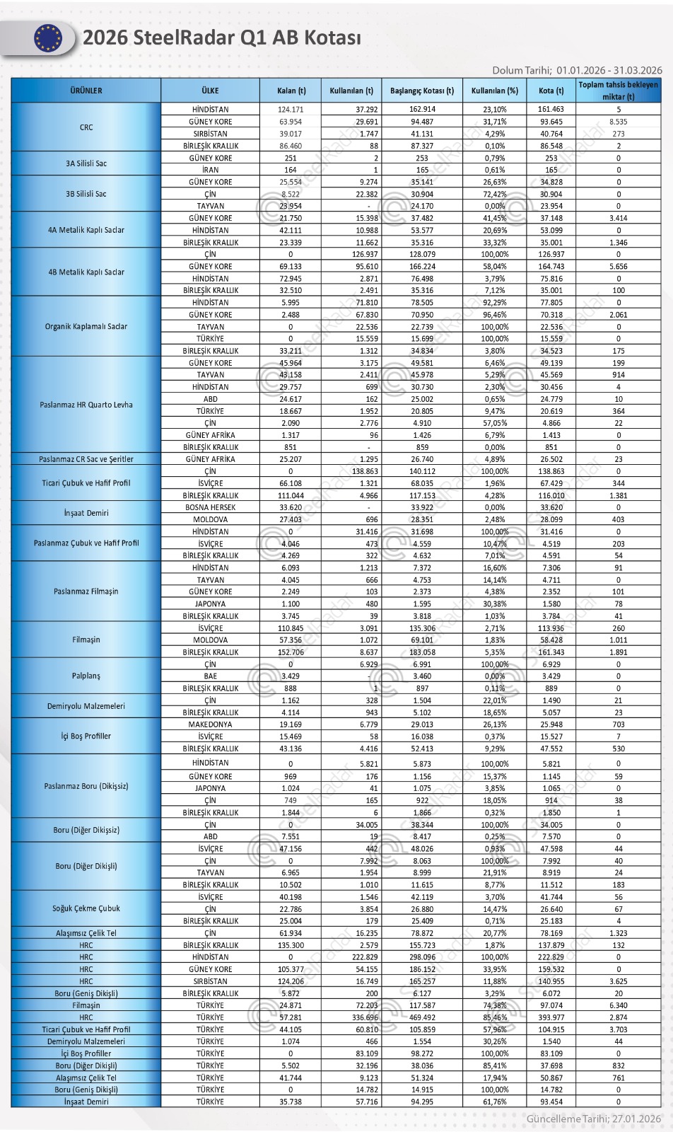 SteelRadar’ın Avrupa Komisyonu verilerinden derlediği haftalık kota değerlendirmesine göre, birçok üründe başlangıç kotaları tamamen kullanılarak kalan miktar sıfırlandı.