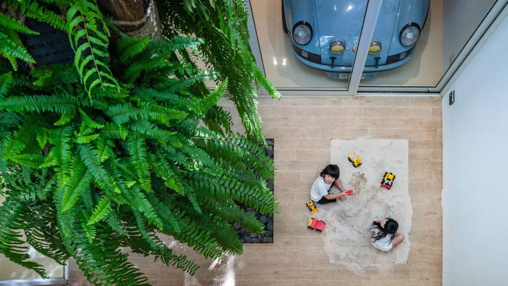 Evin odak noktası, açık bir avlu ve cam duvarlı iç garajı içeren zemin kattır. Brownhouses, garajı Thongtour'un geniş araba koleksiyonunu sergileyecek ve evin her tarafına bakacak şekilde tasarladı.