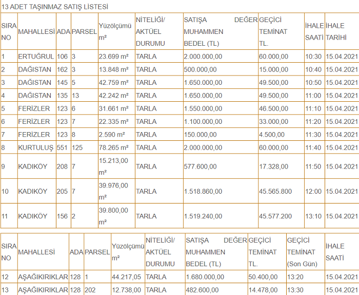 1- Mülkiyeti Kurumumuza ait İlçemiz muhtelif mahallelerinde bulunan 13 adet taşınmaz 2886 Sayılı Devlet İhale Kanunu’nun 45. maddesi uyarınca satış ihalesi Açık Teklif Usulünde yapılacaktır.