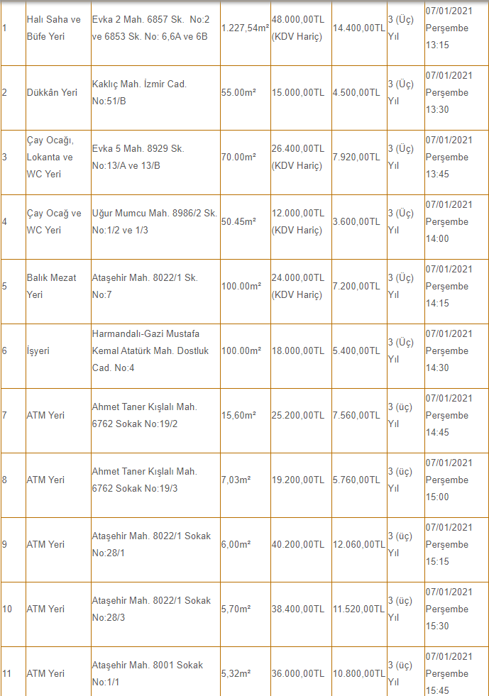 07/01/2021 tarih ve Perşembe günü Çiğli Belediyesi Encümen Salonunda Yukarıda ayrıntıları belirtilen Belediyemize ait taşınmazların kiralanma ihalesi tabloda belirtilen saatlerde, 2886 sayılı Devlet İhale Kanununun 45.maddesine göre Açık Teklif Usulüyle yapılacaktır. Bahsi geçen yerler içlerinde mevcut kiracılar var iken ihale edilecek olup, kiralanan taşınmazlar tahliye edildikten sonra 15 gün içerisinde Noter tasdikli Kira Sözleşmesi yapılarak ihaleyi alana teslim edilecektir.