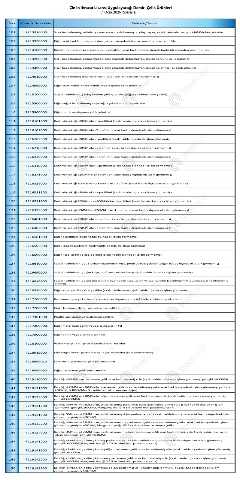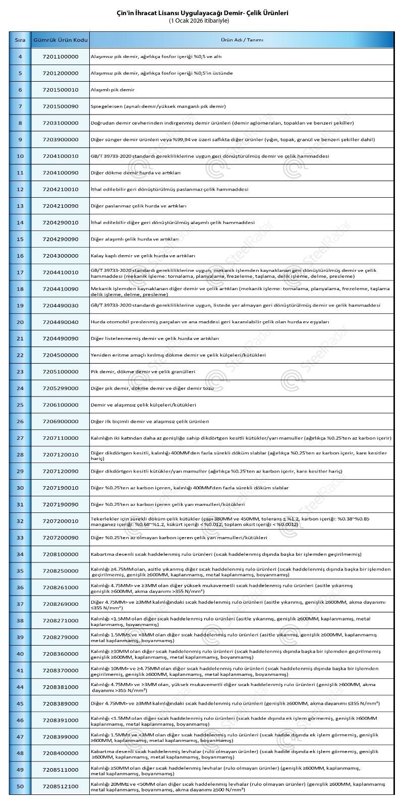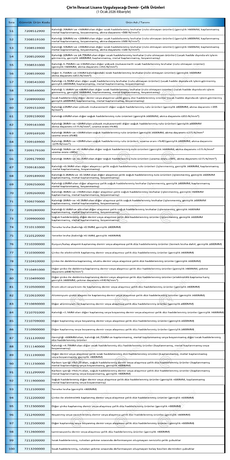İhracat lisansı yönetimine tabi bazı çelik ürünlerinin listesi ise şu şekilde;