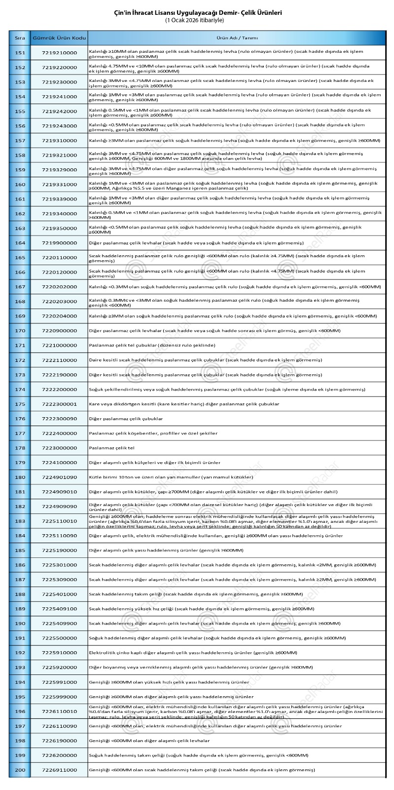 Söz konusu karar, Çin Halk Cumhuriyeti Dış Ticaret Kanunu, İthalat ve İhracat Mallarının Yönetimi Yönetmeliği ile İhracat Ruhsatlarının Yönetimi Tedbirleri başta olmak üzere ilgili mevzuat çerçevesinde alındı. Bu kapsamda, “İhracat Ruhsatına Tabi Mallar Kataloğu (2025)” üzerinde değişikliğe gidilerek bazı çelik ürünleri listeye dahil edildi. Lisans kapsamına alınan ürünlerin ayrıntıları ek listede yer alıyor.