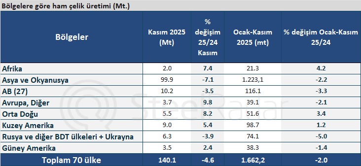 Dünya Çelik Birliği (WorldSteel) 2025 yılının kasım ayı ham çelik üretim rakamlarını açıkladı. Buna göre, 70 ülkenin dünya ham çelik üretimi, 2025 yılının kasım ayında bir önceki yılın aynı ayına göre %4,6 düşüşle 140,1 milyon ton (Mt) oldu.