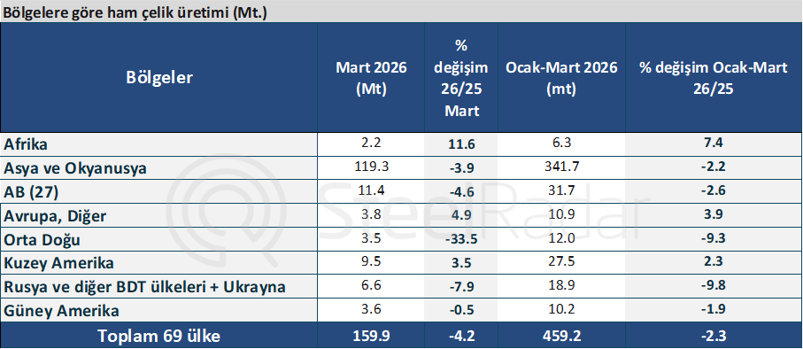 Dünya Çelik Birliği 2026 yılının mart ayı ham çelik üretim rakamlarını açıkladı. Buna göre, 69 ülkenin dünya ham çelik üretimi, 2026 yılının mart ayında bir önceki yılın aynı ayına göre %4,2 azalarak 159,9 milyon ton (Mt) oldu.