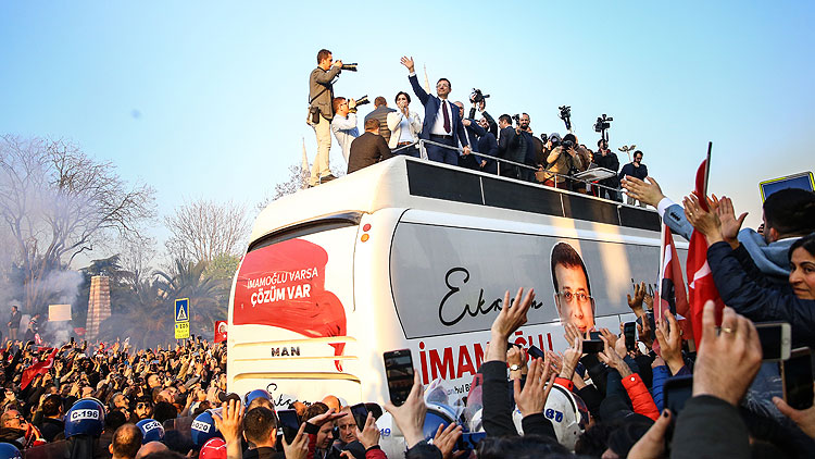 Uysal'dan görevi devralan İmamoğlu, Saraçhane'deki başkanlık binasının önündeki otobüsten halka hitap etti.