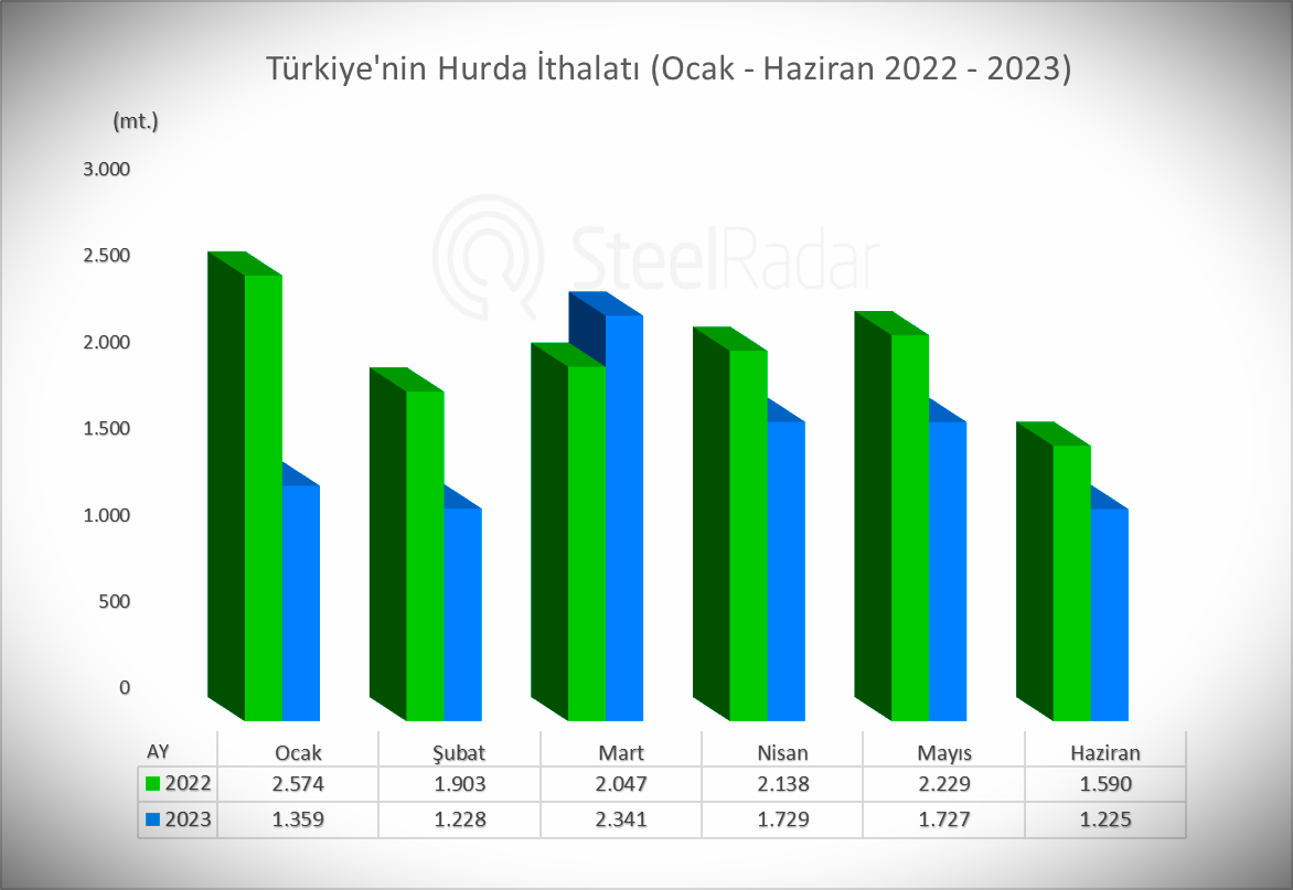 Haziran ayında Türkiye'nin hurda ithalatı, geçen yılın haziran ayına göre %23 azalışla 1 milyon 590 bin tondan 1 milyon 225 bin tona geriledi.