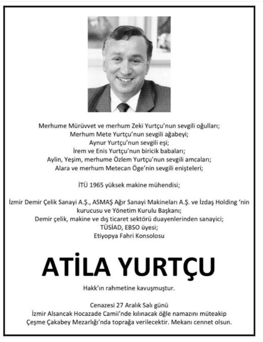 İzmir Demir Çelik Sanayi A.Ş., ASMAŞ Ağır Sanayi Makineleri A.Ş. ve İzdaş Holding'in kurucusu ve Yönetim kurulu başkanı; Demir Çelik, makine ve dış ticaret sektörü duayenlerinden sanayici; TÜSİAD, EBSO üyesi, Etiyopya Fahri konsolosu ATİLLA YURTÇU vefat etmiştir.