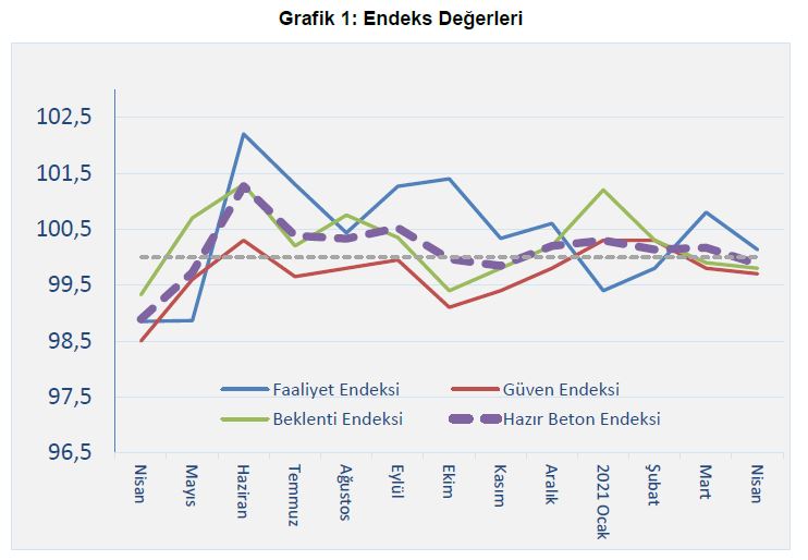 THBB, her ay merakla beklenen Hazır Beton Endeksi’nin 2021 Nisan Ayı Raporu’nu açıkladı. 2021 yılına düşük seviyede başlayan, mart ayında yılın en yüksek seviyesine ulaşan faaliyet nisanda bu yükselişi sürdürememiş, kısmi bir düşüş göstermekle beraber eşik seviyenin üzerinde tutunmaya devam etmiştir. Buna karşılık hem güven hem de beklenti eşik değerin altında kalmıştır.