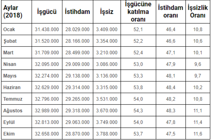 Türkiye genelinde 15 ve daha yukarı yaştakilerde işsiz sayısı 2018 yılı Ekim döneminde geçen yılın aynı dönemine göre 501 bin kişi artarak 3 milyon 788 bin kişi oldu. İşsizlik oranı 1,3 puanlık artış ile yüzde 11,6 seviyesinde gerçekleşti. Bir önceki dönemde yüzde 11,4 seviyesindeydi. Böylece, işsizlik oranı 6 aydır üst üste yükseliş göstermiş oldu.