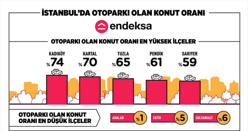 Otoparklı konutların en çok bulunduğu ilçeler incelendiğinde Anadolu Yakası ön plana çıkıyor. Otoparklı konutların en çok bulunduğu ilçelerin başında yüzde 74 ile Kadıköy geliyor. Kadıköy'deki her 4 konuttan neredeyse 3'ünün açık veya kapalı otoparkı bulunuyor.