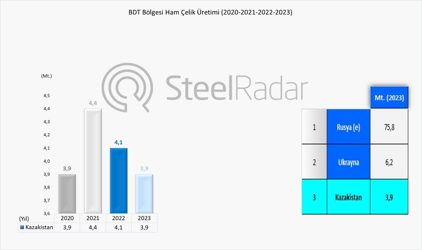 Worldsteel'e göre, Kazakistan'daki çelik üretim hacminin 2023 yılında bir önceki yıla göre %5,5 azalarak 3,9 milyon ton seviyesinde gerçekleşeceği tahmin ediliyor. Ülke, dünyanın önde gelen üreticileri sıralamasında 37. sırada, BDT'de ise üçüncü sırada yer aldı.