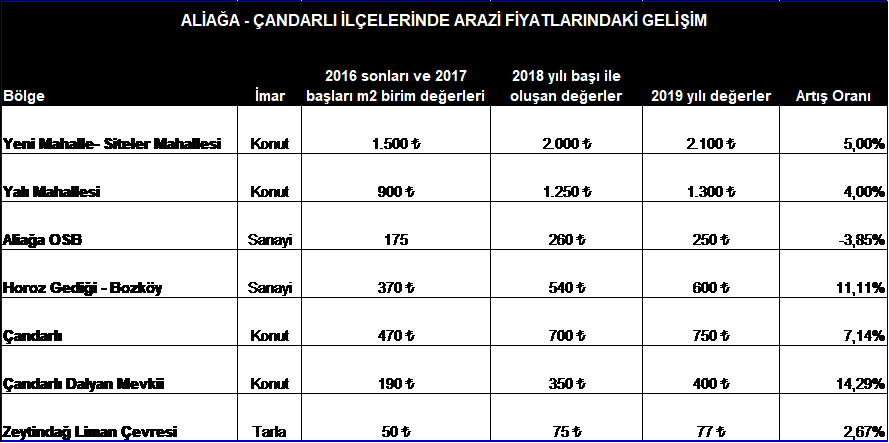 Aliağa’daki konut piyasası hakkında bilgi veren Akkaya, şunları belirtti: “Siteler mahallesinde 3+1 yeni dairelerin birim fiyatları 2400-2800 TL/m2 civarında, Kurtuluş mahallesi civarında yeni konutların fiyatları 2200-2500 TL/m2 arasında. Aliağa’nın yerleşmiş dokusu içerisinde bulunan Kültür mahallesinde ise konut fiyatlarının 2.500-3.000 TL/m2 arasında değiştiği görülüyor. Ticari imarlı arsalarda günümüz yatırım konjonktürü nedeniyle artış görülmezken, sanayi arsalarında ise %15 civarında artış söz konusu. Son bir yılda ülke genelindeki durağan konut piyasasına rağmen Çandarlı’daki konut fiyatlarında %9 civarında artış kaydedildi. 2016 yılından bugüne bakıldığında ise Liman ve Otoyolu gibi büyük projelerin etkisinde %93 oranında değer artışı yaşandı. Aynı dönem içinde İzmir genelinde nominal konut fiyat artışı %30 civarında gerçekleşti.”