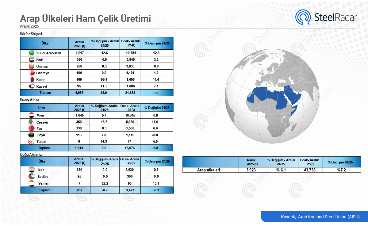 Dünya Çelik Birliği verilerine göre, bölgenin toplam ham çelik üretimi Ocak–Aralık 2025 döneminde %7,2 artarak 43,738 milyon tona ulaştı. Aralık ayında üretim 3,923 milyon ton ile yıllık %6,1 artış gösterdi.