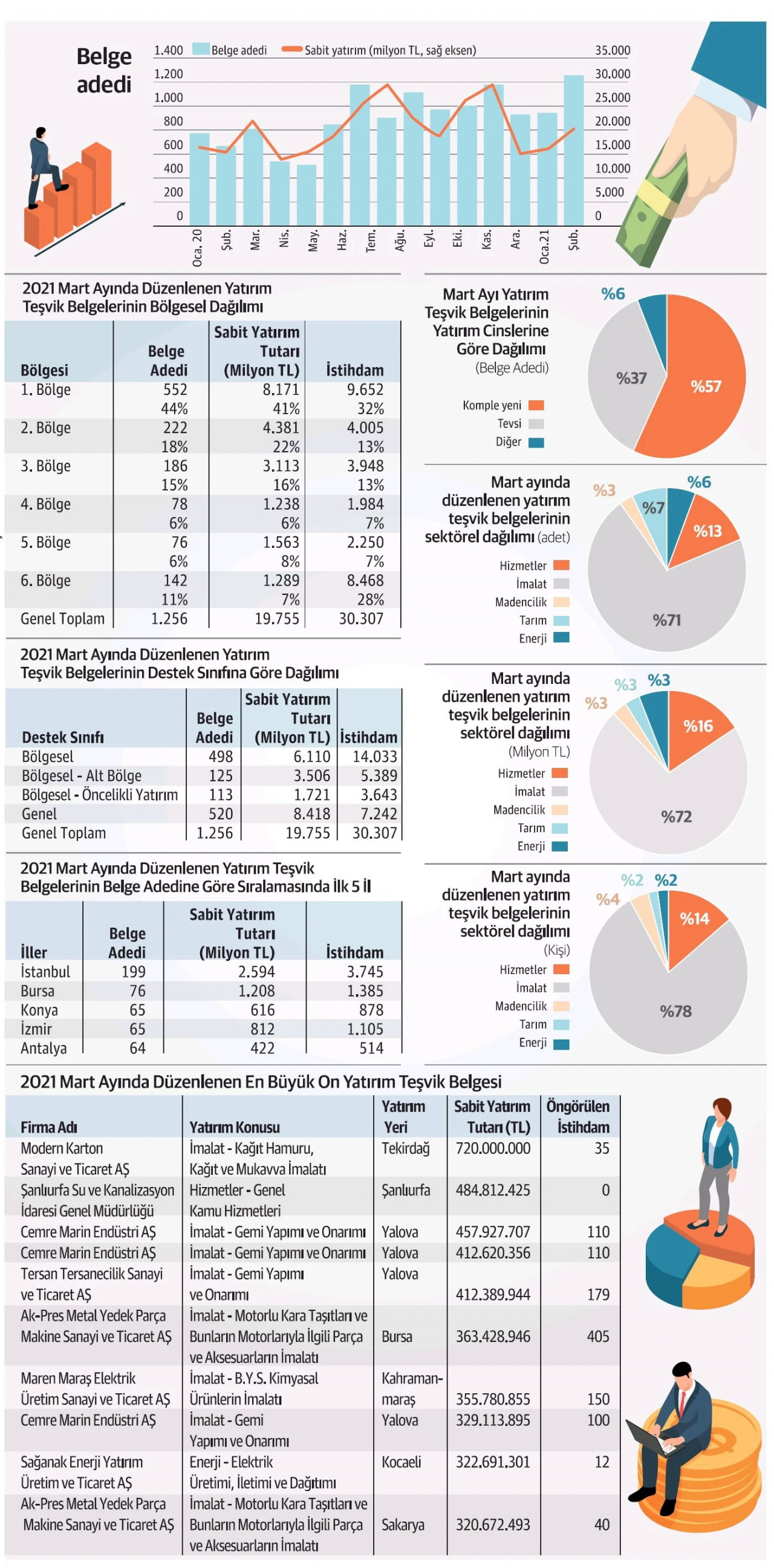 2021 Ocak-Mart döneminde öngörülen sabit yatırım tutarı toplam 50,2 milyar TL olan 3.124 adet Yatırım Teşvik Belgesi düzenlendi. Bu belgelerde toplam 83.162 kişilik istihdam öngörüldü.