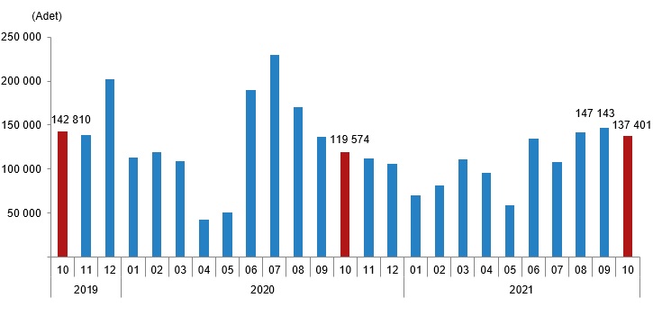 Türkiye genelinde konut satışları Ekim ayında bir önceki yılın aynı ayına göre %14,9 artarak 137 bin 401 oldu. Konut satışlarında İstanbul 26 bin 41 konut satışı ve %19,0 ile en yüksek paya sahip oldu. Satış sayılarına göre İstanbul'u 13 bin 466 konut satışı ve %9,8 pay ile Ankara, 8 bin 218 konut satışı ve %6,0 pay ile İzmir izledi. Konut satış sayısının en az olduğu iller sırasıyla 22 konut ile Hakkari, 45 konut ile Ardahan ve 84 konut ile Bayburt oldu.