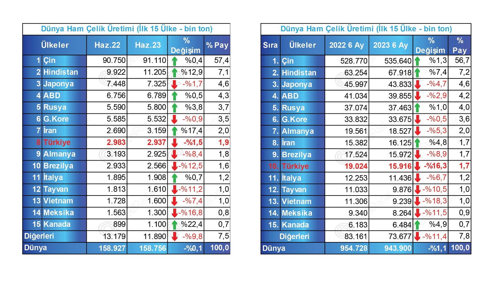 - 2023 yılının Haziran ayında, Türkiye'nin çelik ürünleri ihracatı, miktar bazında %40,8 azaldı. Yassı ürünlerde %43,9, uzun ürünlerde %34,6, yarı ürünlerde %86,8 azalış görüldü. Yılın ilk yarısındaki azalış, miktar bazında %46,5 oldu.