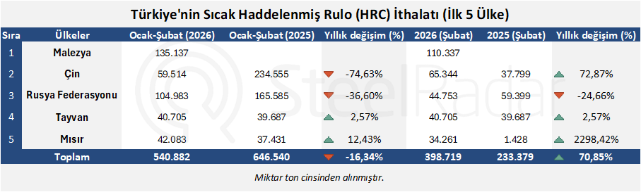 Ocak 2026’da 142 bin 162 ton seviyesinde gerçekleşen HRC ithalatı, bir önceki yılın aynı ayına göre %65’in üzerinde düşüş kaydetmişti.