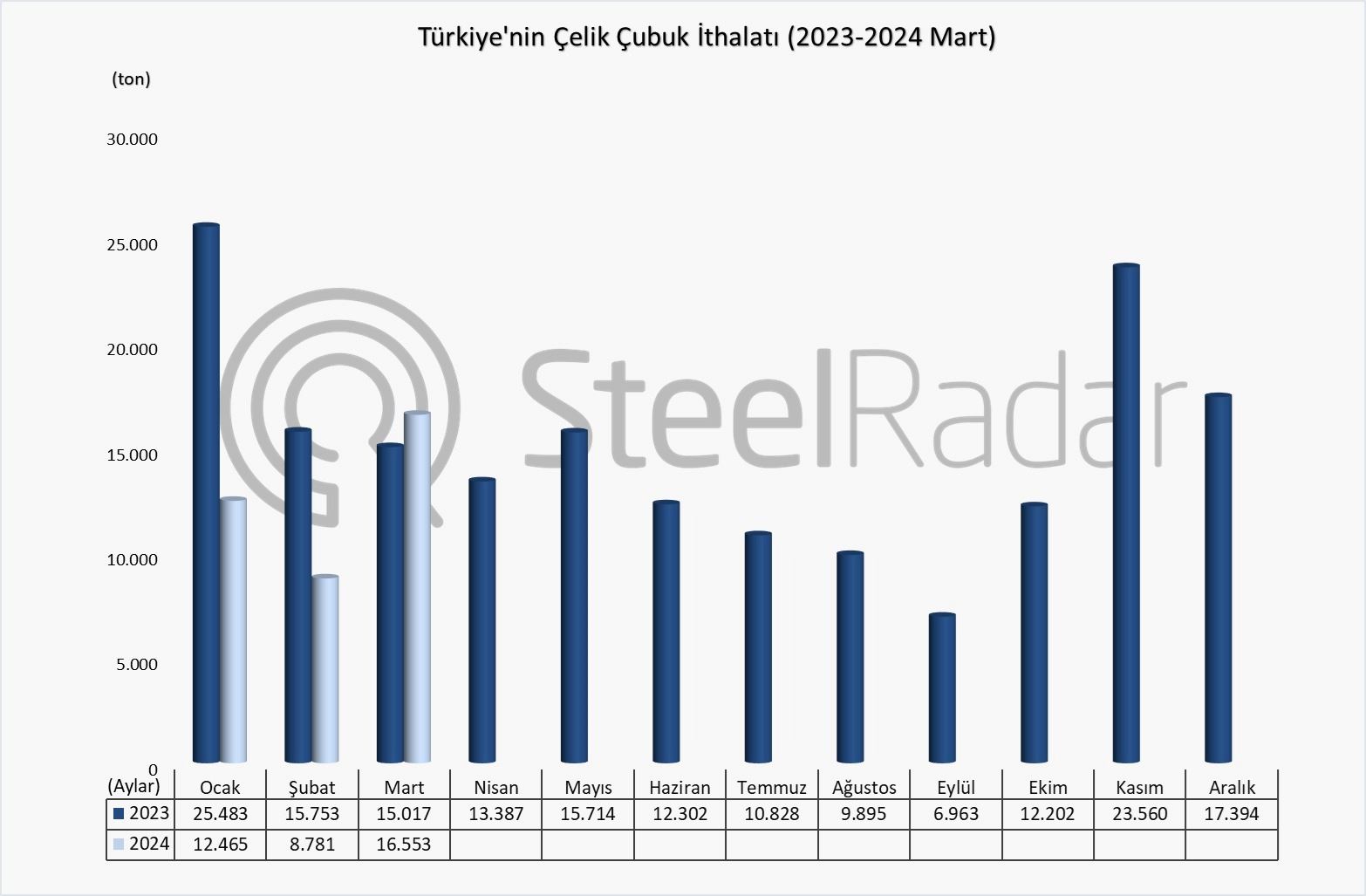 Ocak-Mart dönemi toplam çelik çubuk ithalatı ise bir önceki yılın aynı dönemine göre, %32,8 azalarak 56.252 tondan 37.799 tona geriledi.