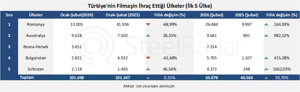 Söz konusu ayda Türkiye filmaşin ihracatında Romanya, Avustralya ve Bosna-Hersek ilk 3 sırada yer aldı. Romanya’ya yapılan filmaşin ihracatı 26.484 ton olurken, Romanya'yı 9.641 tonla Avustralya, 7.314 tonla Bosna-Hersek izledi.