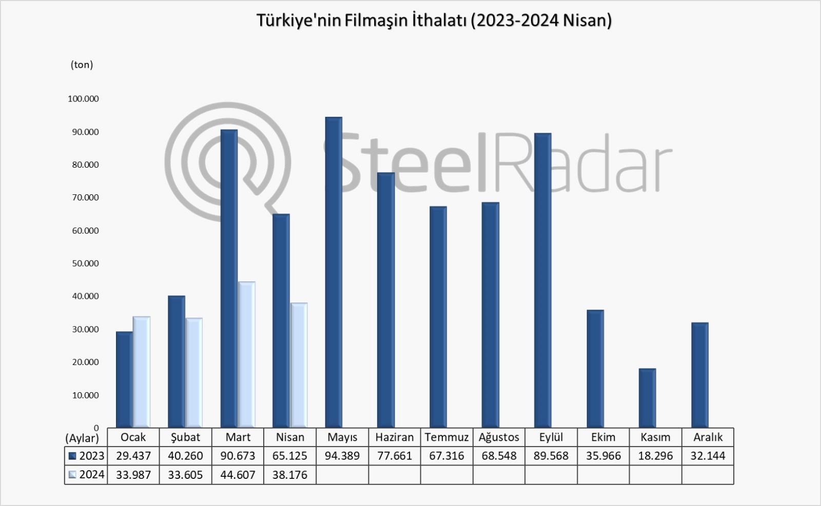 Ocak-Nisan dönemi toplam filmaşin ithalatı ise %33,3 azalarak 225.496 tondan 150.375 tona geriledi.
