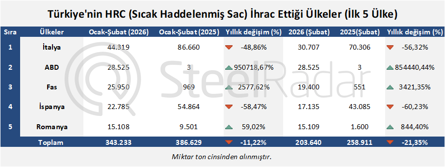 Ocak-Şubat dönemi toplam HRC ihracatı ise %11,22 azalarak 386.629 tondan 343.233 tona geriledi.