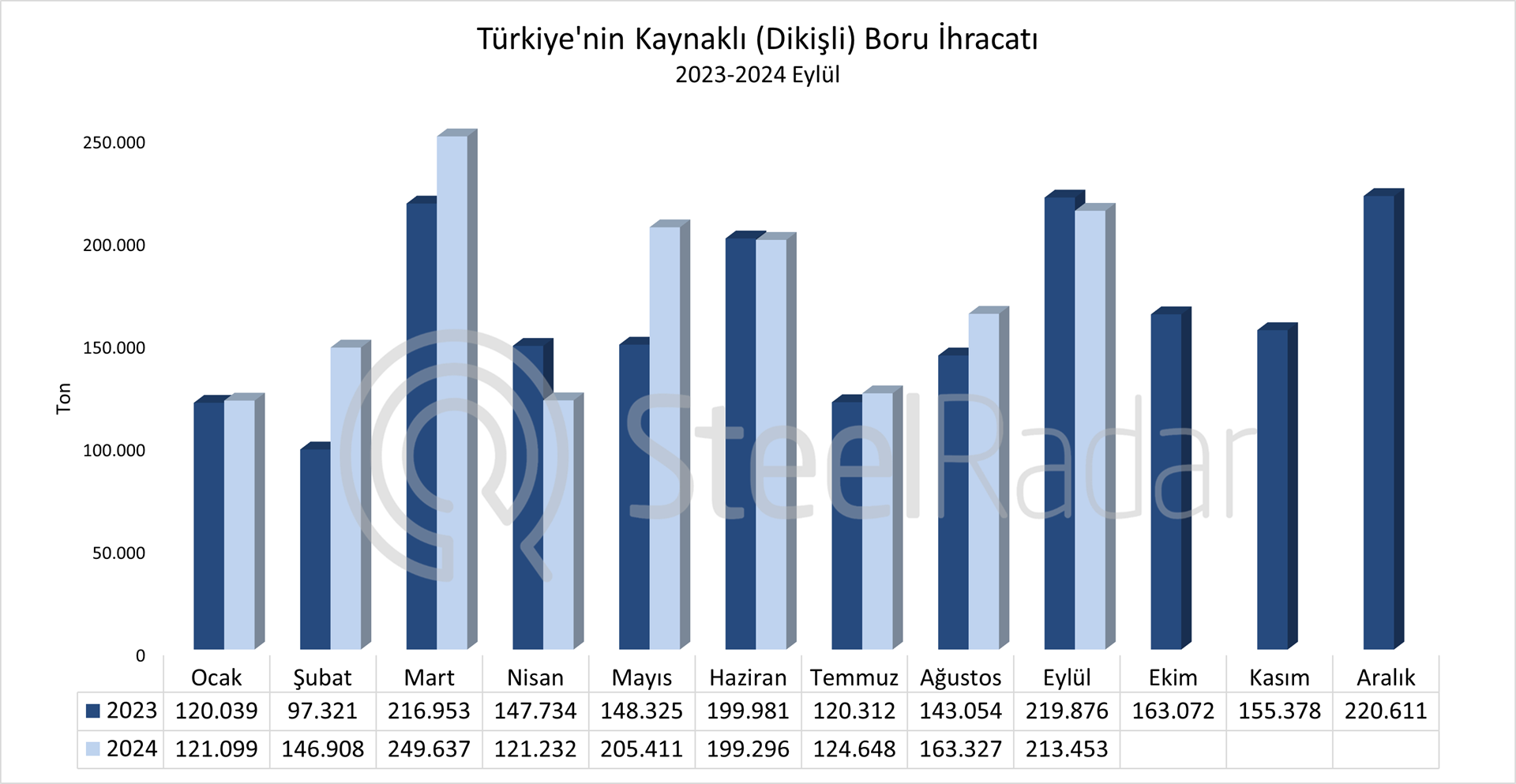 SteelRadar’ın Türkiye İstatistik Kurumu (TÜİK) verilerinden derlediği bilgilere göre, Türkiye’nin 2024 eylül ayı kaynaklı (dikişli) boru ihracatı bir önceki yılın aynı ayına göre %2,9 azalarak 219.876 tondan 213.453 tona geriledi.