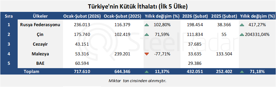 Şubat ayında ülke bazında ithalat incelendiğinde, Rusya Federasyonu ilk sırada yer aldı. Rusya’dan yapılan ithalat 198 bin 454 ton olarak gerçekleşirken, Çin 111 bin 834 ton ile ikinci sırada yer aldı. Cezayir, Malezya ve Birleşik Arap Emirlikleri de öne çıkan diğer tedarikçiler arasında bulundu.