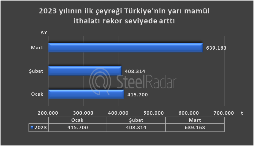 Şubat ayında yaşanan büyük deprem sonrası Mart ayında Türkiye güçlenerek yarı mamül ithalatında %56,5 rekor artışla 639 bin 163 tona yükseldi. Bu yükseliş 2023 yılının ilk çeyreğinde geçen yılın aynı dönemine göre zirve etkisi yarattı.