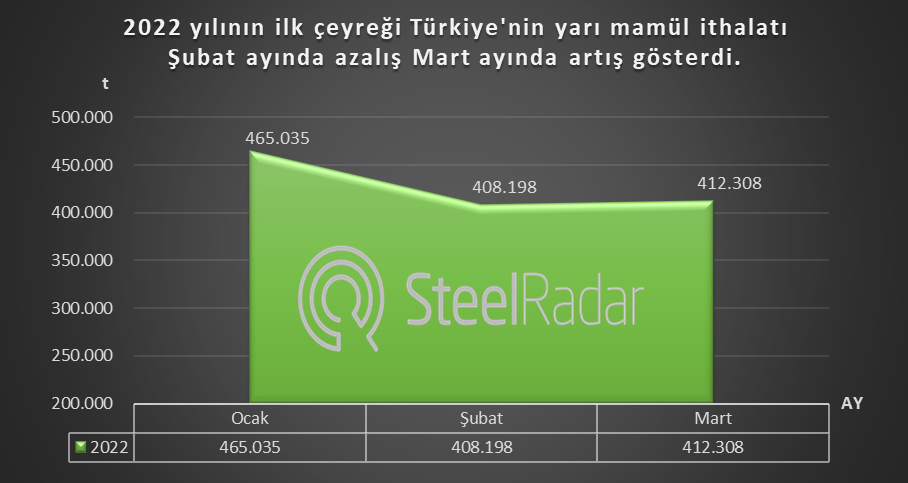 Türkiye çelik üreticileri derneğinin verilerine göre (TÇÜD) Türkiye’nin yarı mamül ithalatı bu yılın mart ayında geçen aya göre %56,5 artış, ocak ayına göre %53,8 oranında yükselişle 639 bin 163 tona yükselerek ilk çeyreğin zirvesinde yer aldı.